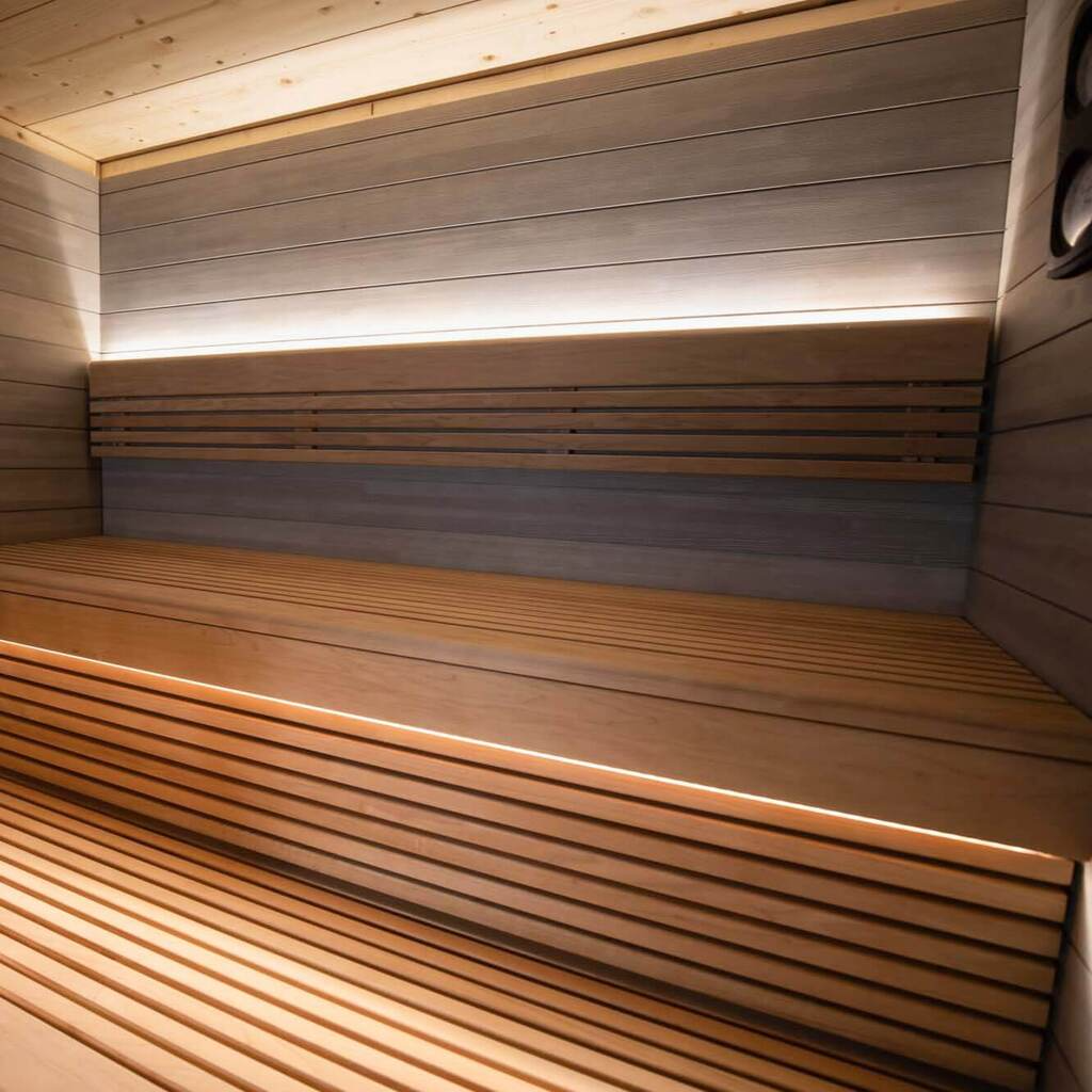 Die speziell für die Sauna ausgewählte LED-Beleuchtung ist unter den Bänken, hinter den Rückenlehnen aus Holz und gelegentlich an der Außenseite der Sauna angebracht.