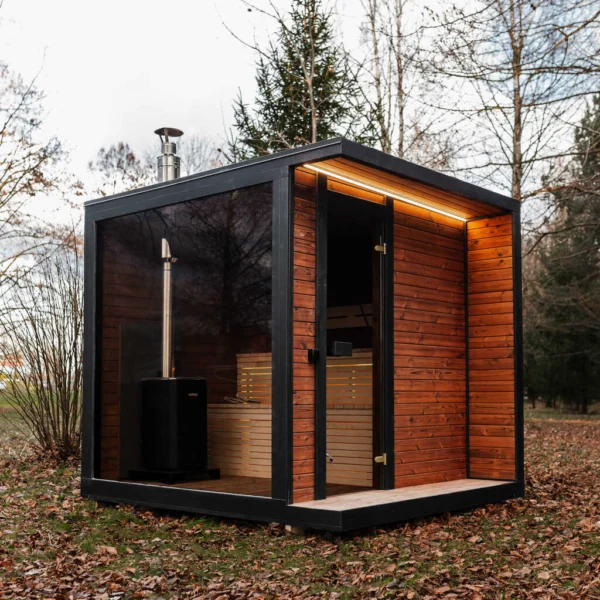 Die speziell für die Sauna ausgewählte LED-Beleuchtung ist unter den Bänken, hinter den Rückenlehnen aus Holz und gelegentlich an der Außenseite der Sauna angebracht.