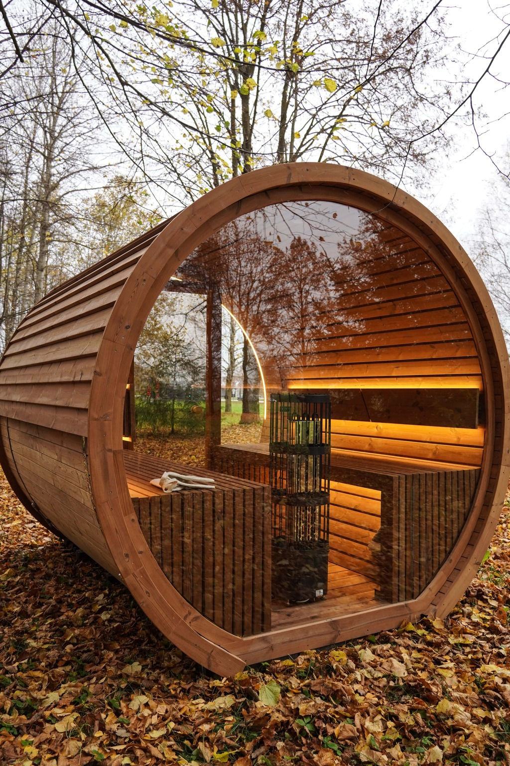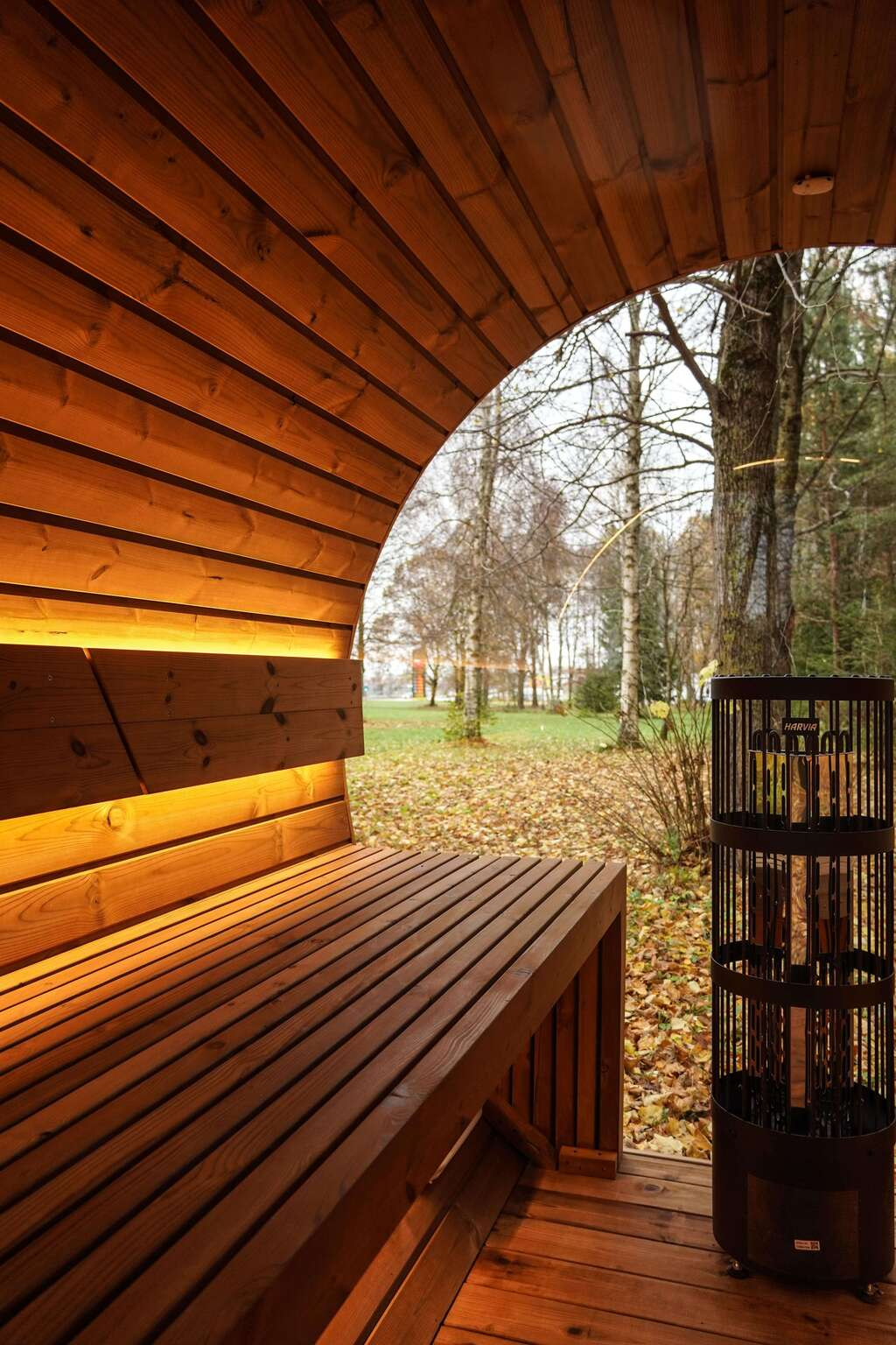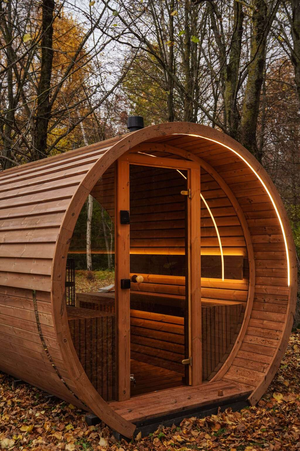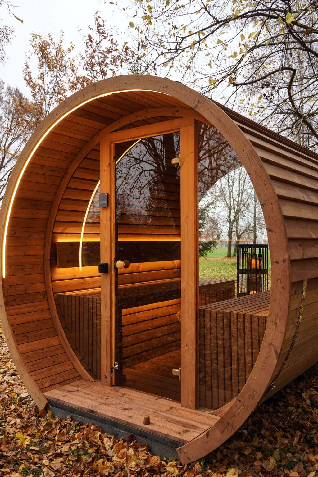 Die speziell für die Sauna ausgewählte LED-Beleuchtung ist unter den Bänken, hinter den Rückenlehnen aus Holz und gelegentlich an der Außenseite der Sauna angebracht.